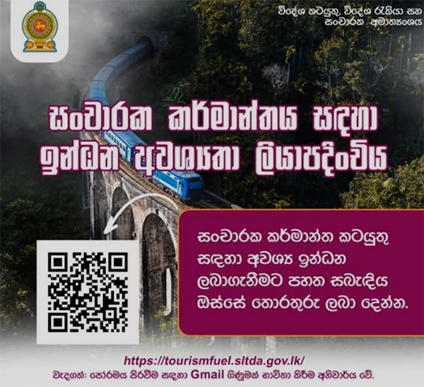 සංචාරක කර්මාන්තය සඳහා ඉන්ධන අවශ්‍යතා වෙනුවෙන් ලියාපදිංචි විය යුතු ආකාරය සම්බන්ධයෙන් විශේෂ නිවේදනයක් නිකුත් කර තිබේ.